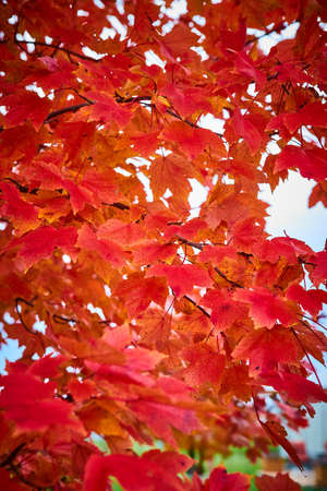 Autumn background of vivid red and scarlet leaves. Maple crown with branches and bright leaves