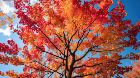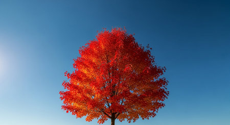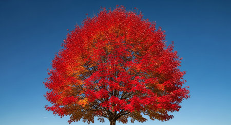 A stunning autumn tree showcasing vibrant red and orange leaves under a clear blue sky. This image captures the beauty and tranquility of nature during the fall season.