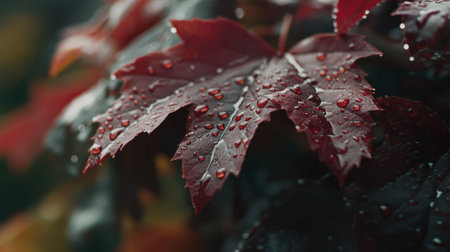A detailed close-up of vibrant red maple leaves adorned with fresh raindrops. This serene image captures the beauty of nature in a peaceful outdoor setting.