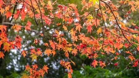 Red and yellow maple leaves on tree branches in autumn park.