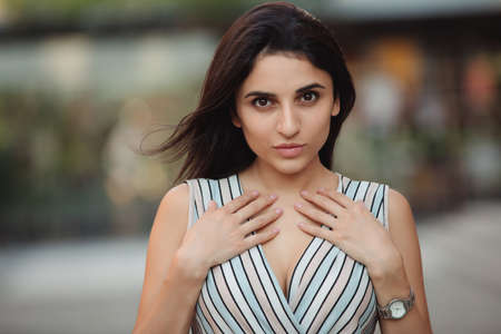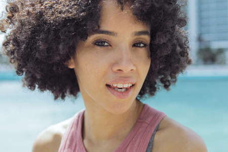Headshot of pretty black girl with short curls and in casual outfit looking sensually at camera on city riverbank.