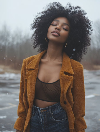 Fashionable young woman in trendy clothing enjoying a winter day outdoors with confidence and beauty. Capturing a modern lifestyle and individual expression in a natural winter setting.
