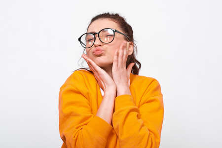 Charming teenager girl blowng air kiss, wears orange sweater and round transparent eyeglasses. Positive student feels joyful posing over white studio wall. People and emotions