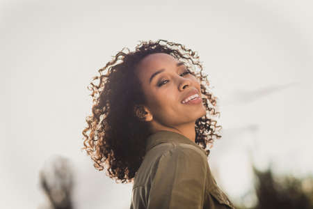 Profile portrait of curly hairstyle charming carefree dark skin lady turning head camera good mood nice weather outdoors
