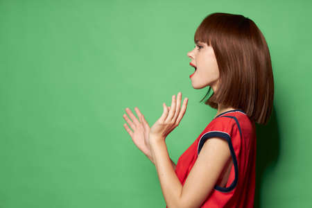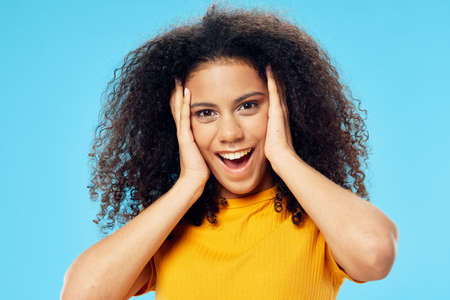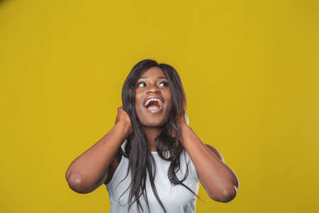 beautiful smiling african american girl with dark hair in a white shirt rejoices on a yellow background