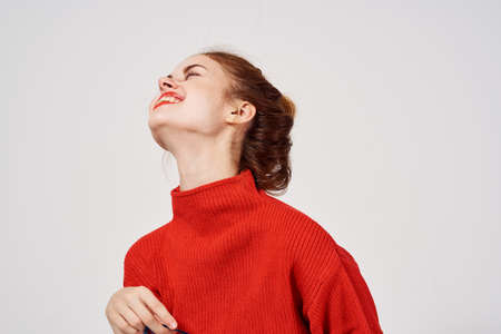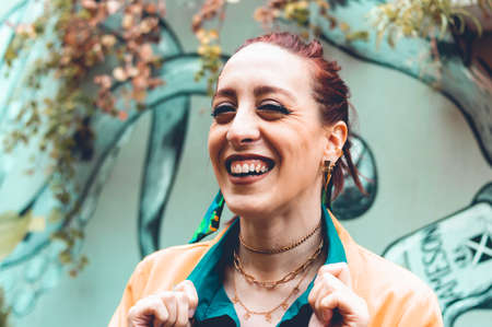 Happy joful adult fashionable woman smiling cheerfully, female being in great mood.
