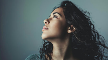 portrait of beautiful young pensive thoughtful woman with long curly hair looking up at copy space