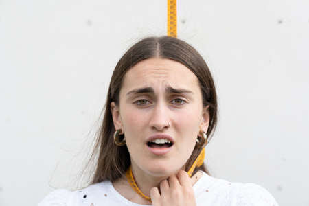 Portrait of teenage girl hanging with measuring tape. Anorexia, eating disorders and social pressure on woman figure concept.