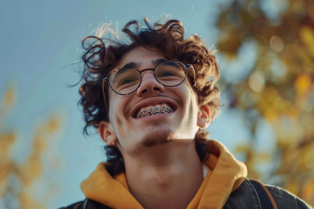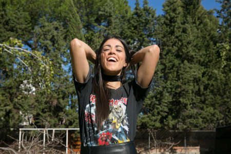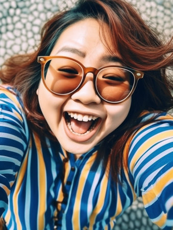 Generative AI : Portrait of happy young asian girl smilelaugh with big teeth and lips in outdoor background with sunlight and copy spaceBeauty blockerstylish fashion model in curly