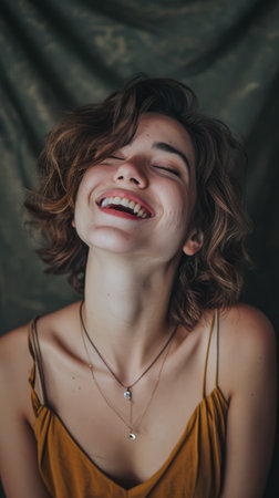 Cheerful young woman with natural freckles and wavy hair, smiling with closed eyes. Relaxed pose conveys happiness, confidence, and authentic beauty.