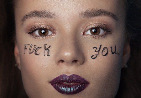 Woman grimacing. Rage facial expression. Bared teeth. Black and white portrait. Copy space.