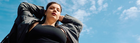 A confident plus size woman stands in a sunlit field, embracing the beauty of nature around her.