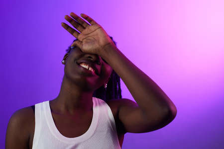 Minimal portrait of carefree African-American woman smiling while standing against purple background in studio, copy space