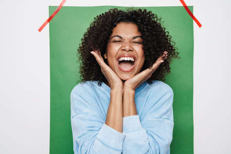 Image of excited african american woman laughing on camera isolated over multicolored background