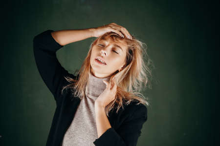 A young man screaming. A male student holding his head on a black background. Modern social problems. Suffering concept.