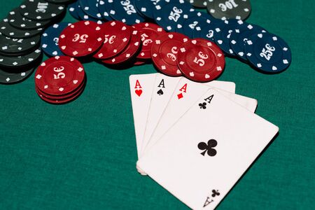 four of a kind of four aces and a Bank of chips on the background of the green table in the casino in poker