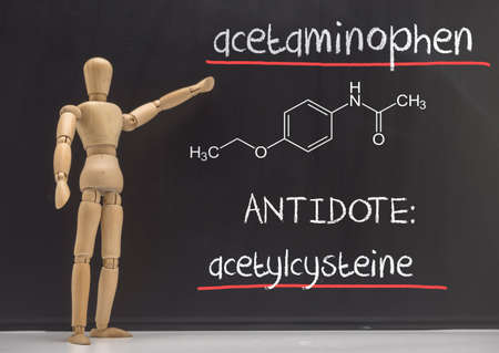 Articulated doll teaches in a slate the paracetamol poisoning in blood, the antidote is the acetylcysteine, conceptual image