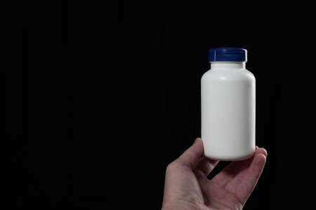 Hand holds white container with lid for liquids on blue background. Rectangular plastic generic bottle with red lid. Side view.