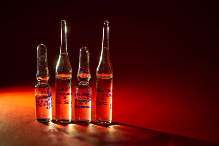 Abstract medical background, an ampoules with red liquid. A group of vaccine in bottles on a yellow background.
