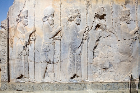 Stone bas-relief of residents of historical empire carved on the stairway facade of the Apadana at the old city Persepolis, capital of the Achaemenid Empire.