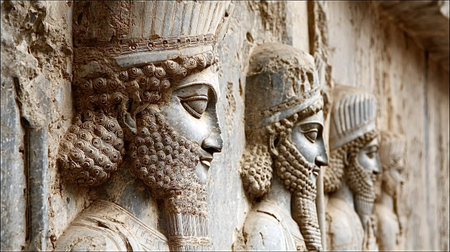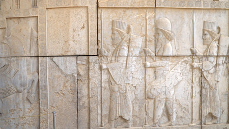 Detailed stone carvings of persian soldiers in traditional attire from persepolis