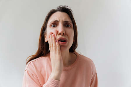 Young handsome young woman expression of horrible suffer from toothache, standing over isolated white background. Frustrated caucasian female touching his cheek suffering terrible strong teeth pain.