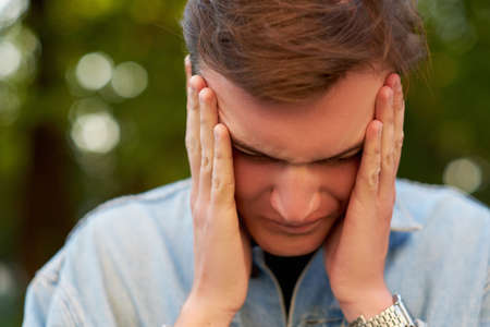 Young man frustrated and suffering headache, close up