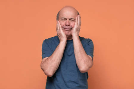 Senior man holding his cheek with hand, suffering from bad toothache.