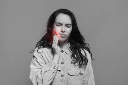 Despaired millennial caucasian woman in casual suffers from toothache and presses her hand to cheek with inflammation