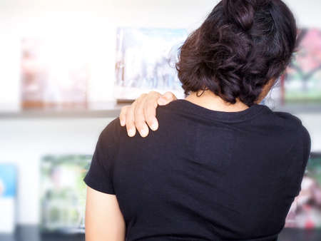 Woman with shoulder pain. Young woman with pain in shoulder. Suffering from pain in shoulder of woman.