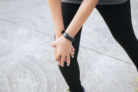 Woman suffering from pain in leg injury after sport exercise running jogging and workout outdoor