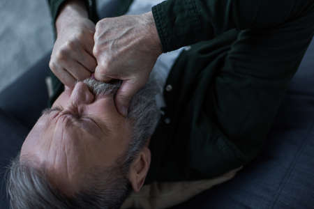 Aching frozen shoulder pain as symptom of rotator cuff tendinitis, adult caucasian male with painful grimace suffering from chronic bursitis