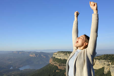 Excited casual woman celebrating vacation raising arms and screaming in the mountain