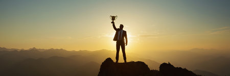 Silhouette of successful businessman standing on top of a mountain and holding a trophy