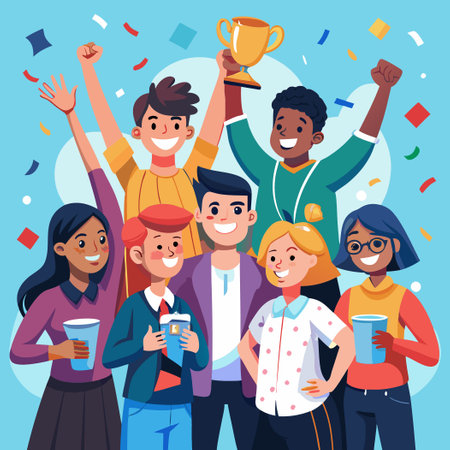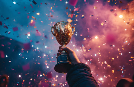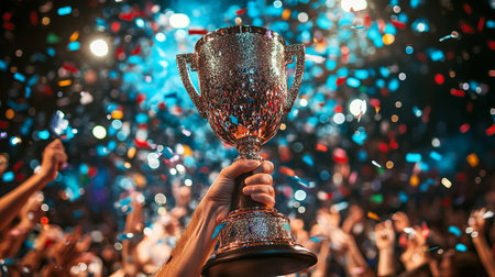 A vibrant celebration scene featuring a person holding a golden trophy high in the air, surrounded by cheering crowd and sparkling confetti.