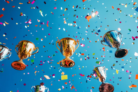Gold, silver, and bronze winner cups gleaming triumphantly in a vibrant sky filled with colorful confetti, creating a dynamic, celebratory atmosphere for award themes