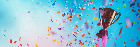 Golden championship cup with magical defocused background and confetti wide banner with copy space