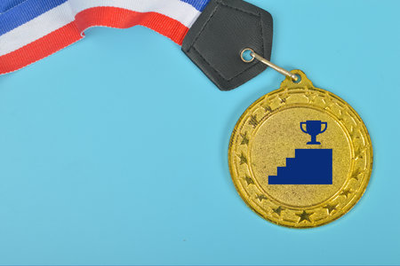 This image features a gleaming gold medal with a luxurious red ribbon resting against a vibrant blue background, perfect for representing accomplishment and success.