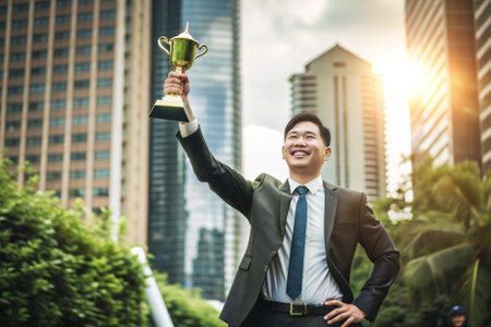 Asian businessman holding a golden trophy cup to cheerful and celebrated his successful in career and mission. concept of winner and competition.