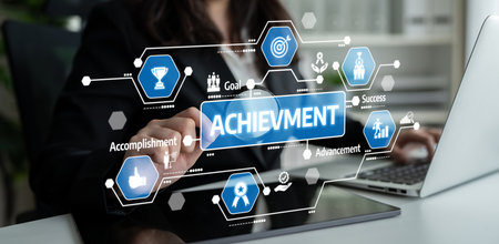 A business professional interacts with technology, highlighting achievement concepts and success metrics, showcasing motivation and progress in a modern workspace.