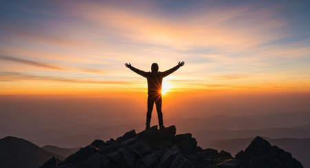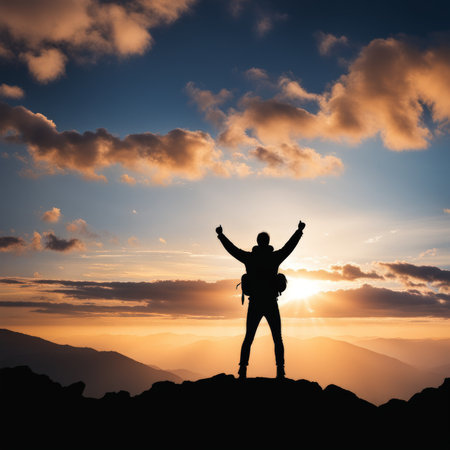 Victorious silhouette stands atop a majestic mountain, arms raised in celebration of success.