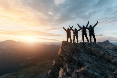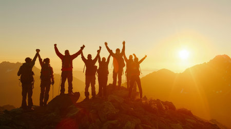 Mountain Achievement. Triumphant silhouettes on a peak, joy of a team celebrating their success, representing beauty of shared victories, cooperation, exhilaration of reaching new heights together