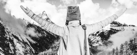 beautiful happy young woman raising hands while standing in scenic mountains, mont blanc, alps