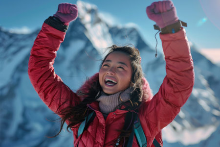 young woman celebrating reaching the peak of ice mountain