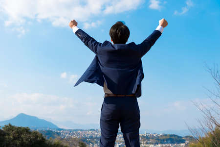 Back view of delighted businessman, outdoor