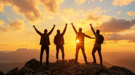 A group of four friends stands triumphantly on a mountain peak, silhouetted against a stunning sunset. They celebrate their adventure and success, creating a beautiful moment of joy and togetherness in nature.