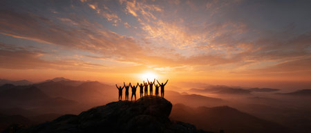Peak triumph: silhouettes a top mountain, joyous group celebrates team success, embodying shared victories, harmonious collaboration, euphoria of collective achievement in nature's majestic embrace