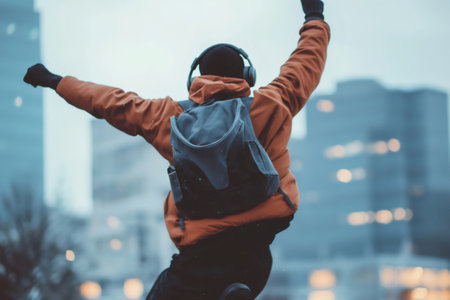 Carefree tourist listening to music and dancing in the city center during winter, wearing an orange jacket, backpack and headphones