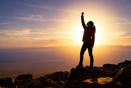 Confident woman in silhouette raises fist triumphantly on a rocky mountain peak at sunset, overlooking vast purple and orange horizon with clouds, symbolizing achievement and strength in outdoor landscape