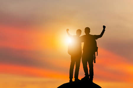 Silhouette of two travelers or hikers standing and raise their hands together on the top of mountain with a morning sky and sunrise and enjoys the moment of successful achievement Generative AI